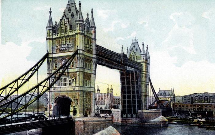 • Odkrytka z Londynu, z namalowanym widokiem Tower Bridge autorstwa nieznanego artysty, pocz. XX w., fot. BE W