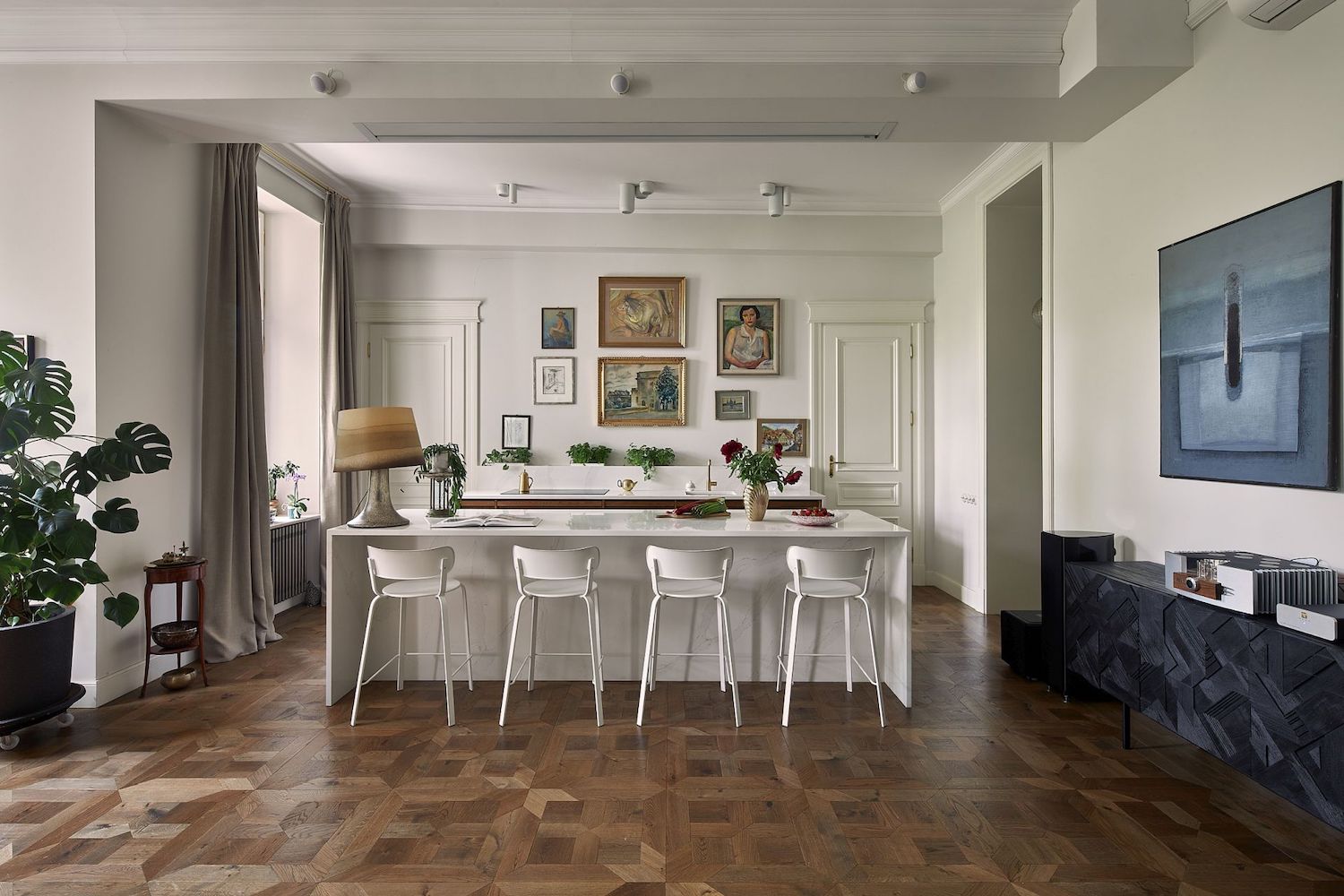 Wnętrze apartamentu to połączenie klasyki z nowoczesnym designem. Wysokie sufity, sztukaterie, stylowa stolarka są tłem dla designerskich mebli, sztuki i sporej dawki koloru.