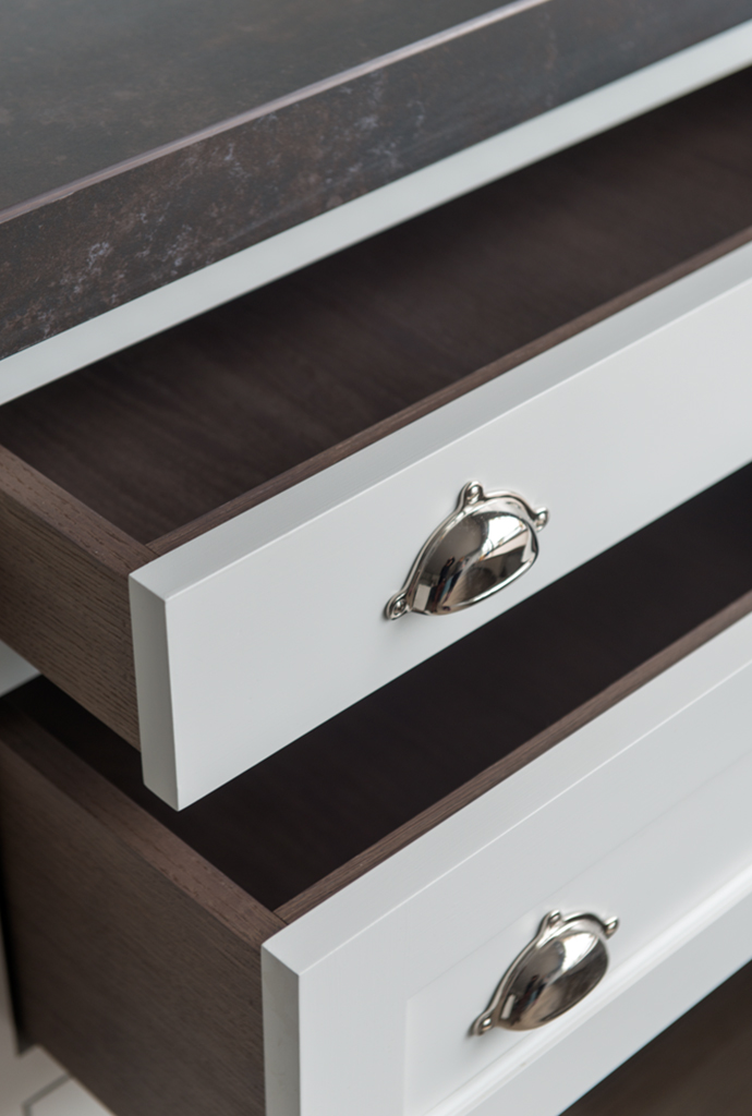 • Wewnątrz szuflad - czekoladowy dębowy fornir.