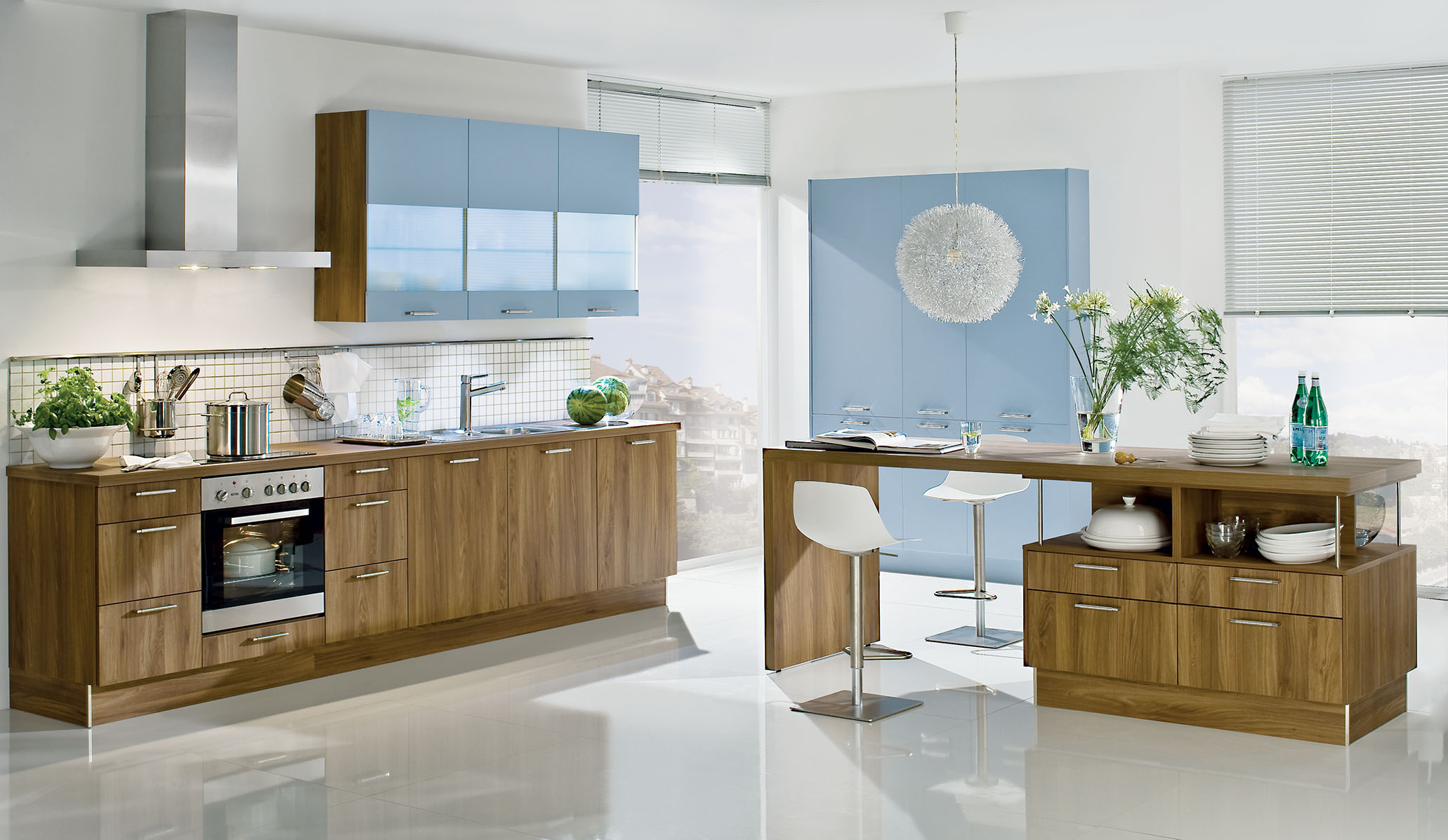 Możesz wybrać piekarnik kompaktowy z mikrofalówką i szufladą do podgrzewania, stalowy zlewozmywak z baterią, płytę indukcyjną, która rozpozna wielkość garnka. I koniecznie sterowany dotykowo okap, jednocześnie... lampa. Kolor? Stalowy z dodatkiem czarne