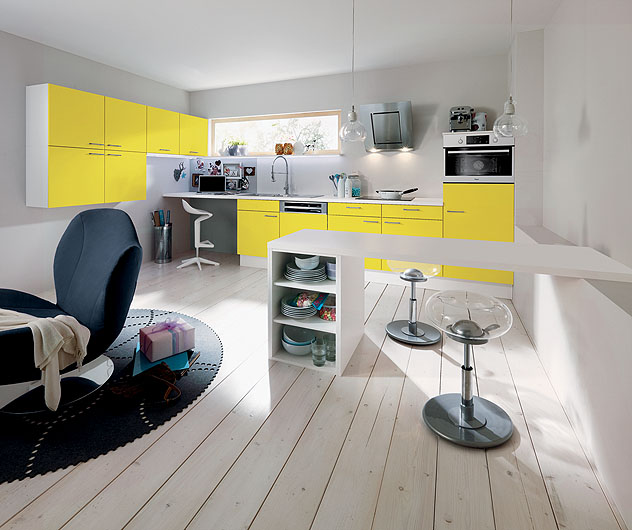 • Biała kuchnia i półki wyróżnione limonkowym kolorem. NOLTE
