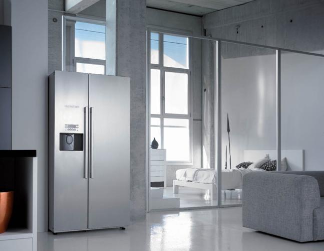 • Przypomina garderobę, a tymczasem to wolno stojąca chłodziarko-zamrażarka side-by-side z drzwiami ze stali