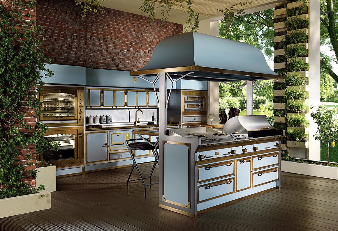 OFFICINE GULLO, kuchnia outdoorowa Pacific Light Blue, emaliowana stal z polerowanymi mosiężnymi wykończeniami.