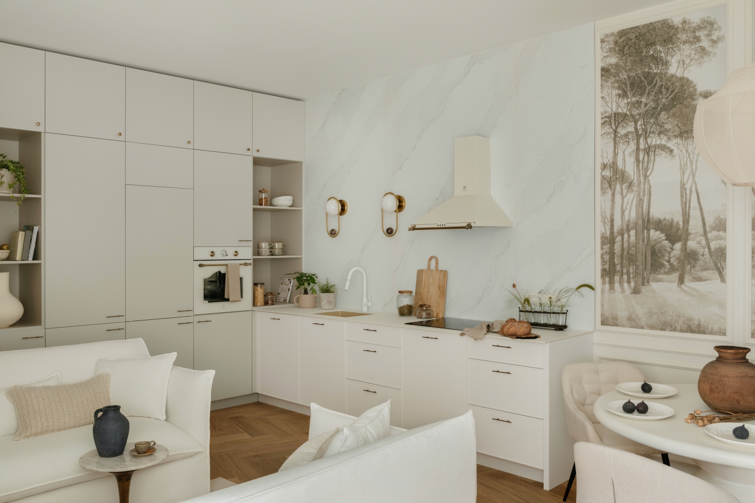 Kaszmirowe mieszkanie z bielą, akcentami beżu i tapetami w oprawie ze sztukaterii. To wnętrze koi zmysły!