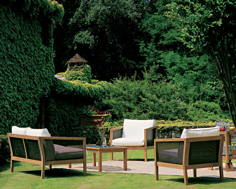 • Kute meble ogrodowe najlepiej wymościć poduchami. Materac i poduszka z tkaniny Nimes Teja. KA INTERNATIONAL
