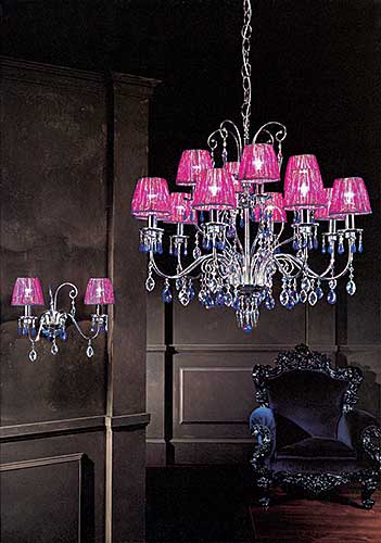 • Żyrandol z kryształami Swarovskiego w kolorze abażurów kosztuje 16 990 zł, a kinkiet - 2400 zł. AMBIENTE