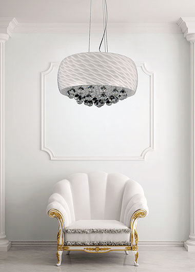 • Masiero Ottocento: pozłacane metalowe ramy i kryształowe ozdoby firmy Swarovski. Cena 4195 euro netto. masiero group