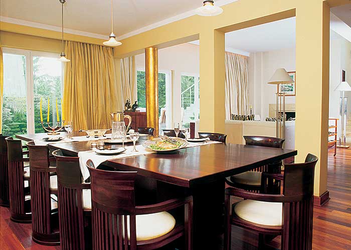 • Charakterystyczne dla tego stylu proste formy mebli, gięte drewno i po mistrzowsku położone forniry.