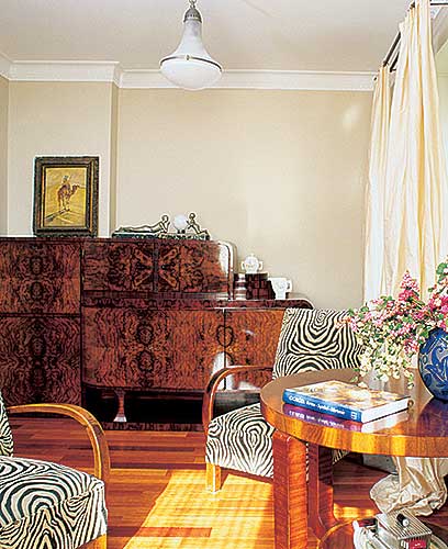 • Pokryta platkami złota kolumna współgra z barwą zasłon, a paski zebry - ulubiony wzór artdekowskich tkanin - kontrastują z