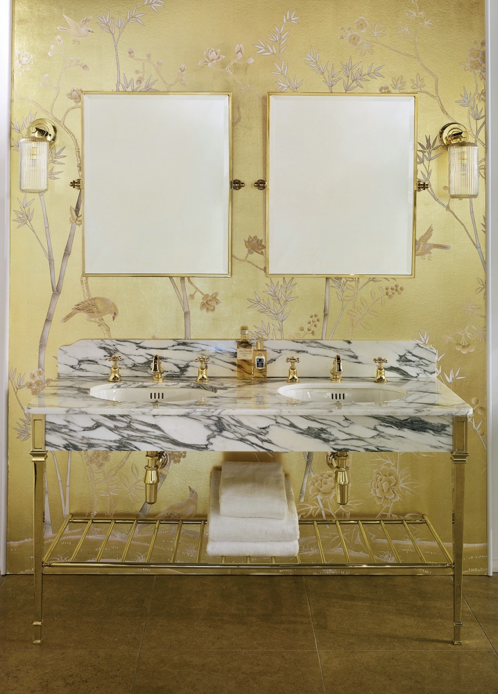 Urodę marmurowego blatu z dwiema umywalkami podkreśla dobrze dobrana tapeta. Choć to różne desenie, nie gryzą się, bo tło jest spokojniejsze. Zdjęcie: Drummonds Bathrooms