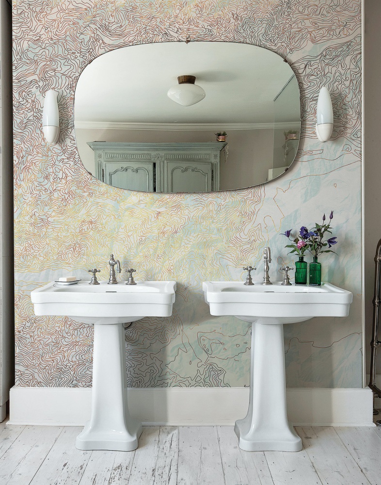 W łazience urządzonej w stylu lat 30. sprawdzą się dwie porcelanowe umywalki na postumentach, zdjęcie: Wall & Deco, wallanddeco.com