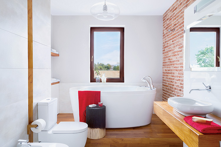 Błyszczący MDF dobrze prezentuje się na tle surowego muru.