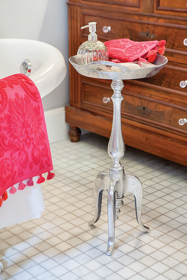Łazienka w stylu retro: wanna na lwich nóżkach Sanimeksu baterie - Armatura Krakowska chromowany stolik-taca z Almi Decor.