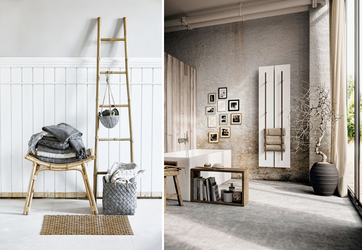 Od lewej: bambusowy stołek i drabinka na ręczniki, Lene Bjerre; TESO ANTRAX to grzejnik, który jest jednocześnie półką na ręczniki; w łazience ciekawie zaaranżowano wannę – przy ścianie obłożonej deskami, obok niej ustawiono zydelek i stolik, KALMAR