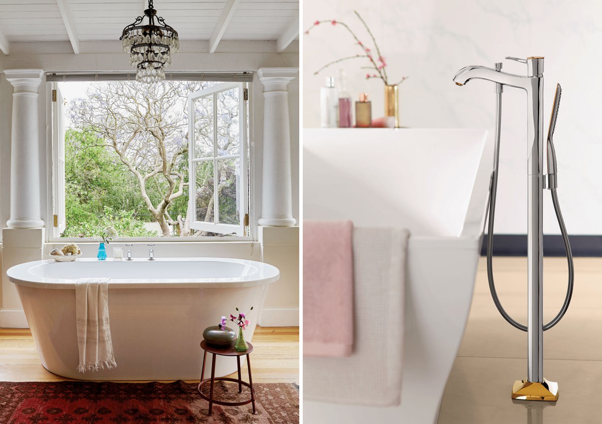 Od lewej: łazienka z kolumnami, drewnianą podłogą i wanną na środku, GAP INTERIORS; Bateria wannowa Metropol Classic, wykończona chromem i złotem, HANSGROHE