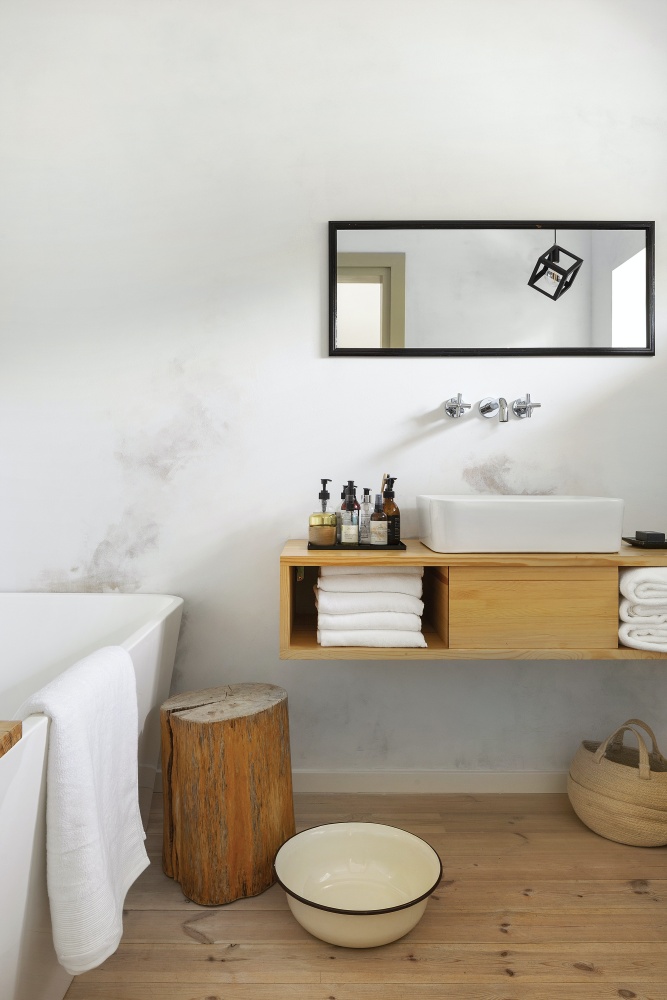 Biała łazienka z drewnem w stylu skandynawskim, ZDJĘCIE: MARCIN GRABOWIECKI, STYLIZACJA: ELIZA MROZIŃSKA