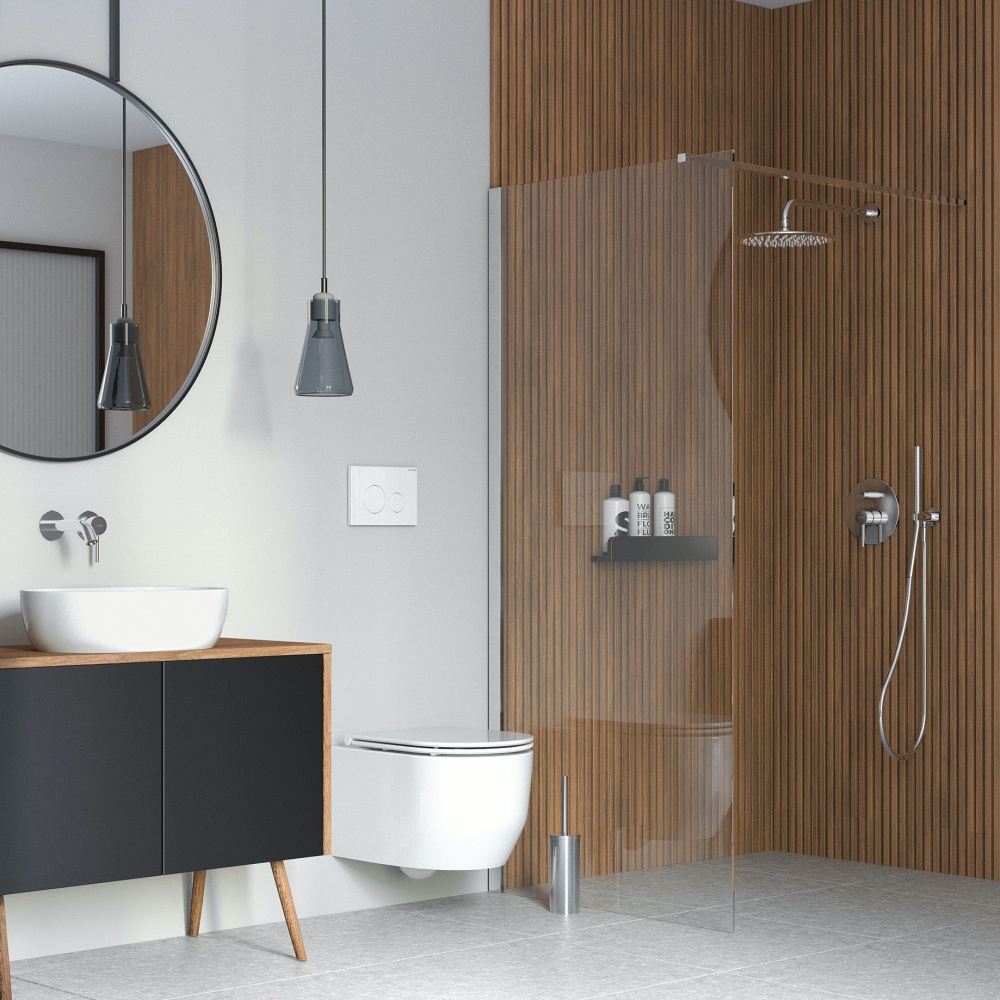 Łazienki Oltens inspirowane są skandynawską harmonią, spokojem oraz miłością do natury. Na zdjęciu: Ścianka prysznicowa Oltens Vida, wisząca miska WC Oltens Holsted z powłoką SmartClean, oltens.com
