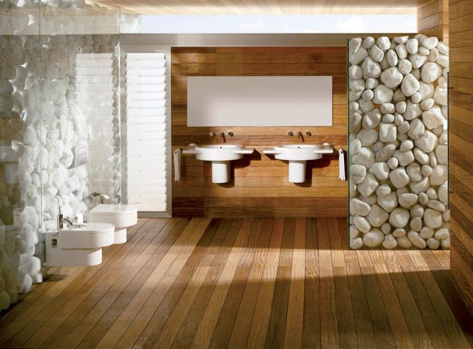 Kamień, drewno i ceramika Happening. Podwieszane wc kosztuje 1424 zł, bidet podwieszany - 1280 zł,