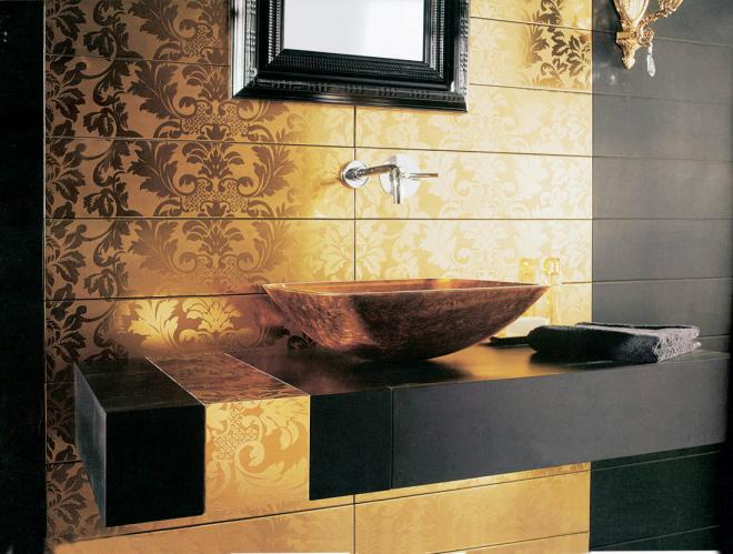 • Za umywalkę Cuadrado Dorado zapłacimy 1250 zł. Do kompletu złote płytki Damasco Pure Golden z kolekcji Megalos firmy Dune