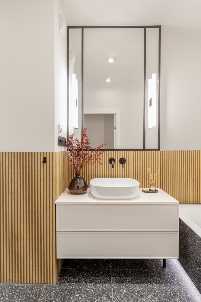 Drewno i czerń to dobrana para. Na ścianach płytki przypominające lamele ocieplają te na podłodze imitujące lastryko, proj. Ada Skwira i Małgorzata Liebhart z WZ Studio, wzstudio.pl, fot. Pion Poziom Marta Behling