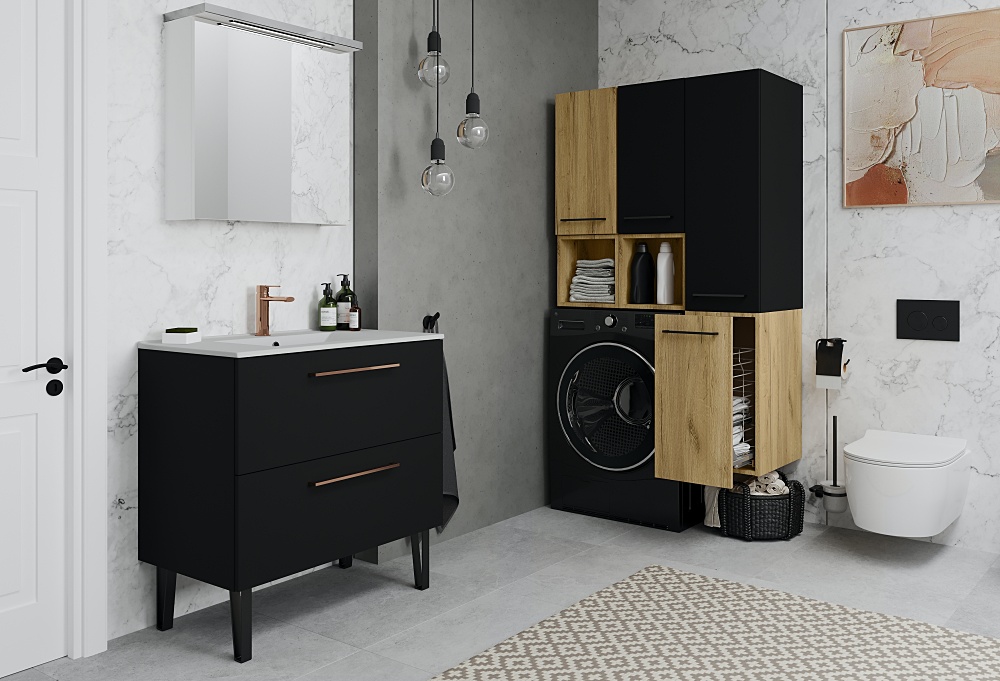 Czerń to kolor ponadczasowy i wszechstronny – śmiało można go zastosować zarówno w przestronnych łazienkach, jak i tych bardzo małych. Na zdjęciu: kolekcja Metro System marki NAS, nas-meble.pl, deftrans.com.pl