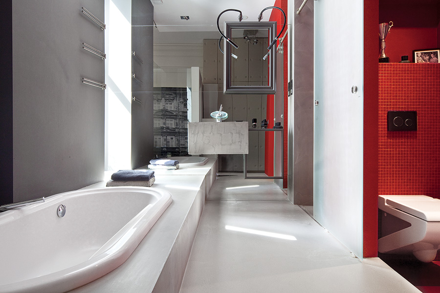 Z widokiem i dobrym dizajnem. Bateria umywalkowa - Hansa, prysznicowa od Hansgrohee. Zabawne kinkiety Snake