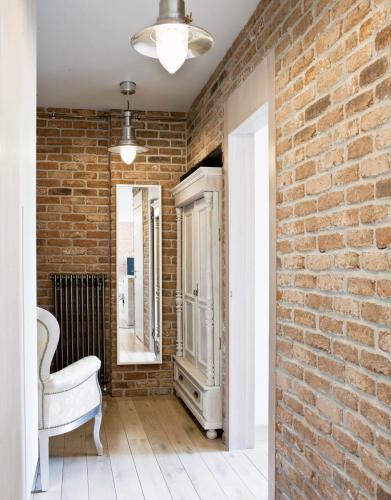 • Ceglana ściana kontrastuje z jasnym wnętrzem.