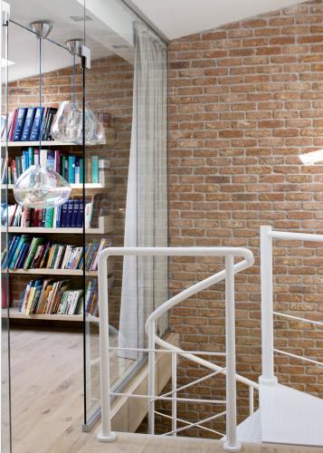 • Ceglana ściana kontrastuje z jasnym wnętrzem.