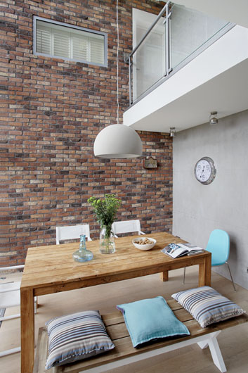 • Błękit, cegła i drewno. Loft z kotami
