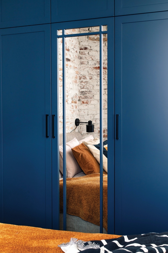 Prosto i ze smakiem. Tak urządzono mieszkanie w krakowskiej kamienicy. Szklana ściana w metalowej ramie nadaje wnętrzu loftowy klimat i pasuje do cegły na ścianie, niebieskich i koniakowych akcentów.