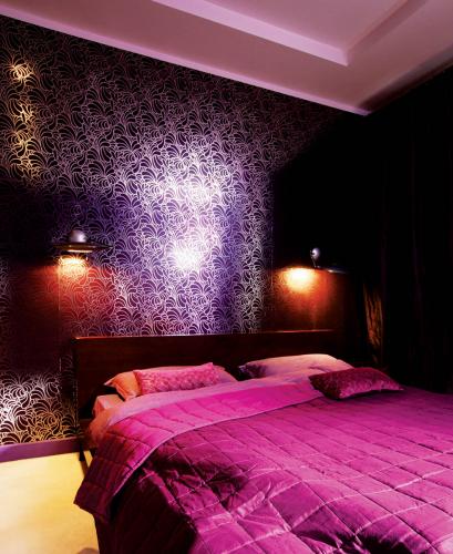 W sypialni jest spokojniej- fioletowo i srebrnie. Mocnym akcentem są lampy w przekornym, troche kosmicznym
