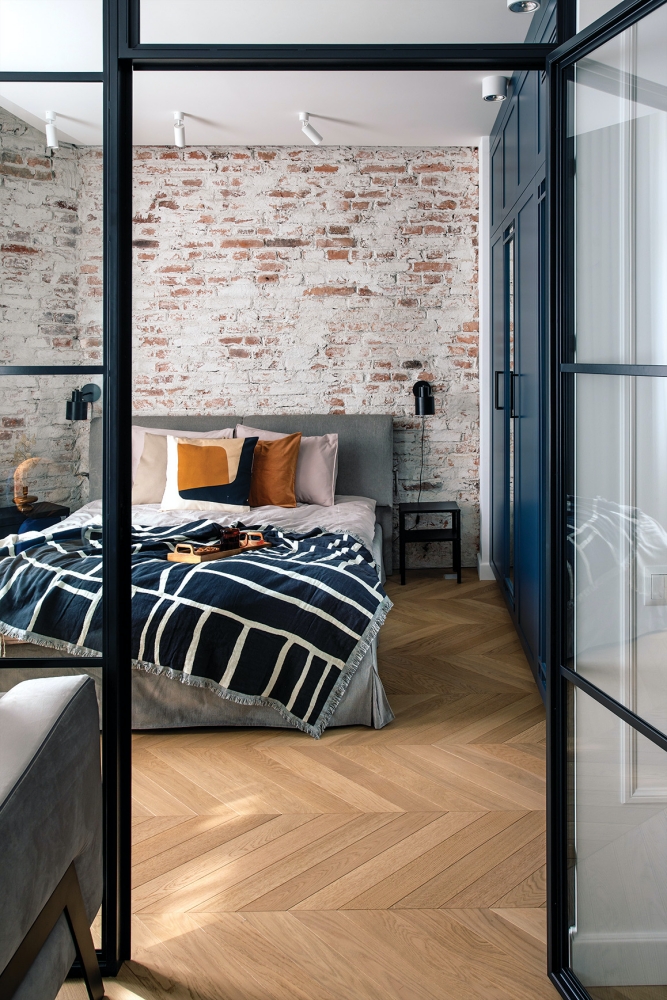 Prosto i ze smakiem. Tak urządzono mieszkanie w krakowskiej kamienicy. Szklana ściana w metalowej ramie nadaje wnętrzu loftowy klimat i pasuje do cegły na ścianie, niebieskich i koniakowych akcentów.