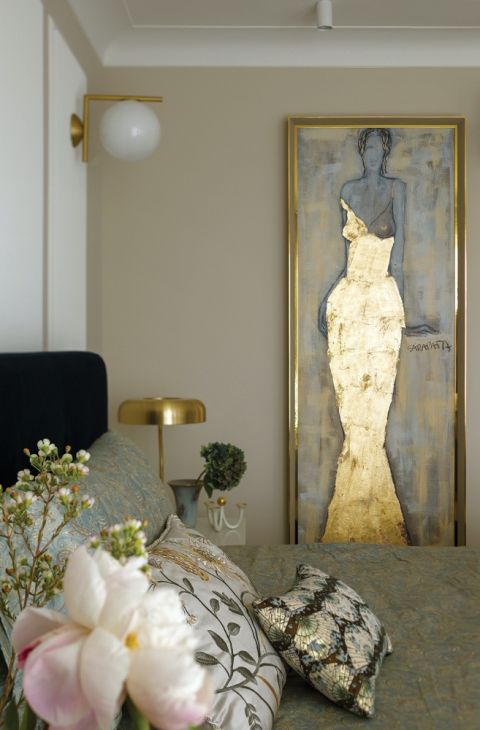 Wnętrza w stylu nowojorskim – malarska tapeta w kuchni robi wrażenie, a złote dodatki dodają im blasku