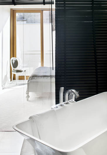 Jeśli ktoś potrzebuje w łazience intymności, wystarczy, że zaciągnie eleganckie czarne żaluzje.