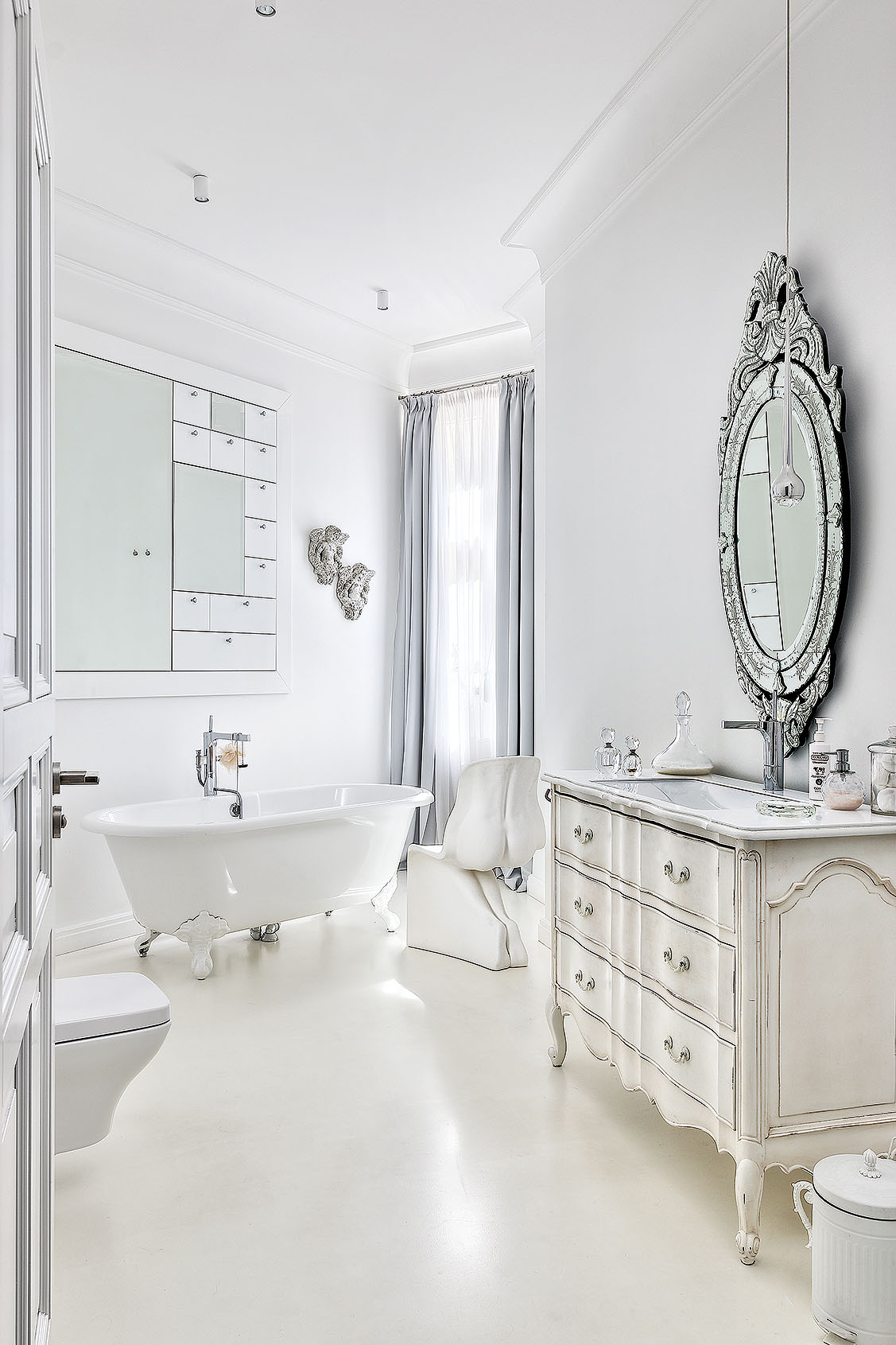 W łazience mieszają się elementy stylowe z dizajnerskimi: obok wanny na ozdobnych nóżkach przezroczysty stołek