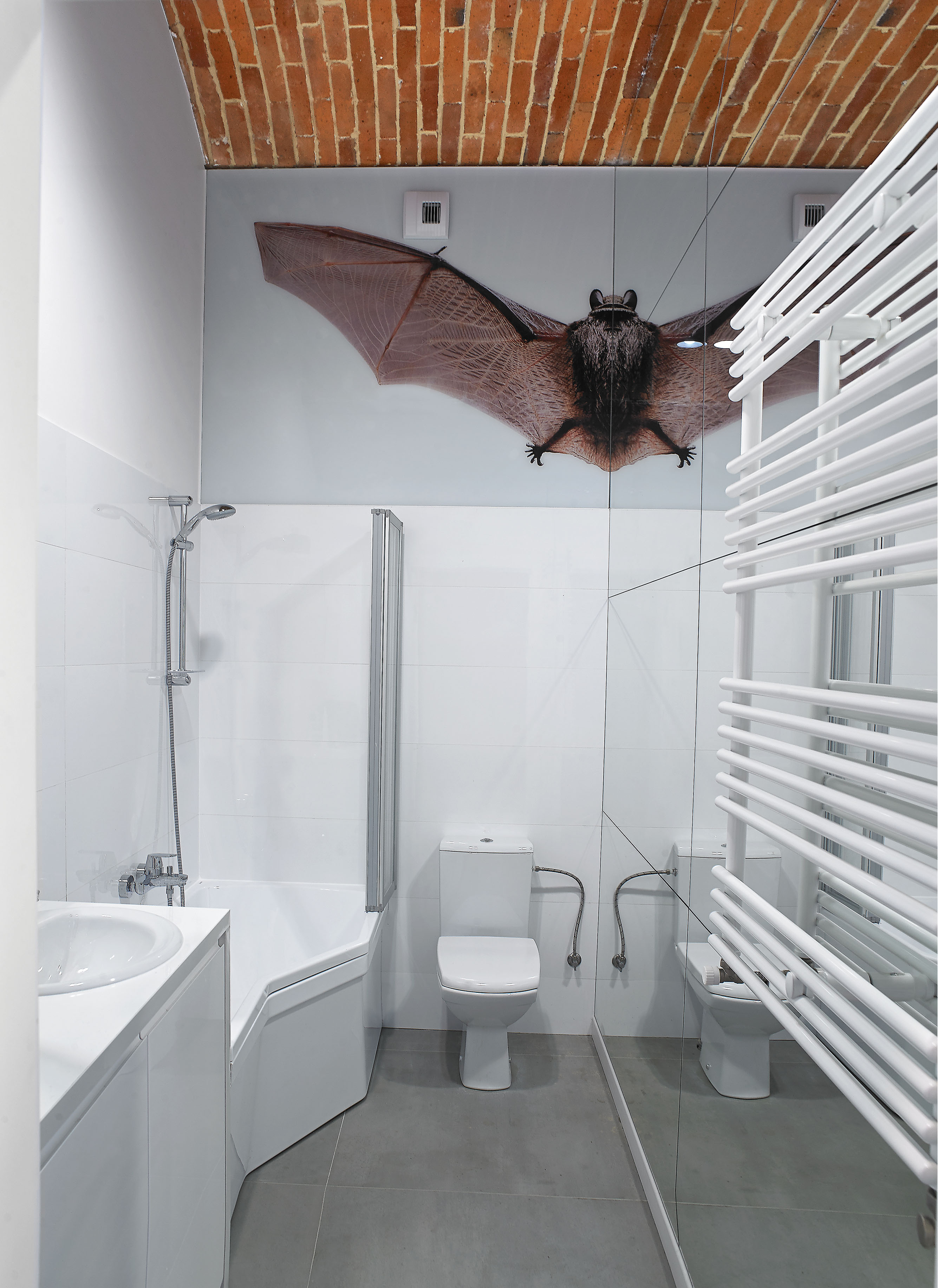 Nietoperz w łazience. Wystarczyła połowa zdjęcia i duże lustro, w którym się odbija. Na szczęście.