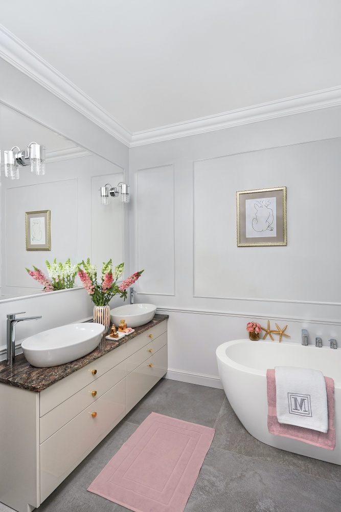 Świetlista szarość i romantyczny róż – duet, który nie wychodzi z mody. Elegancki i ciepły. Magda uważa, że to para idealna. Tak się ubiera i tak mieszka.