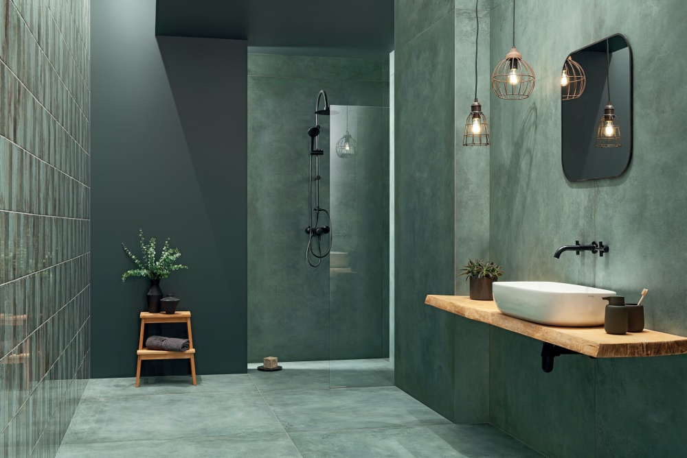 • łazienka z rudymi płytkami i strukturalnym tynkiem