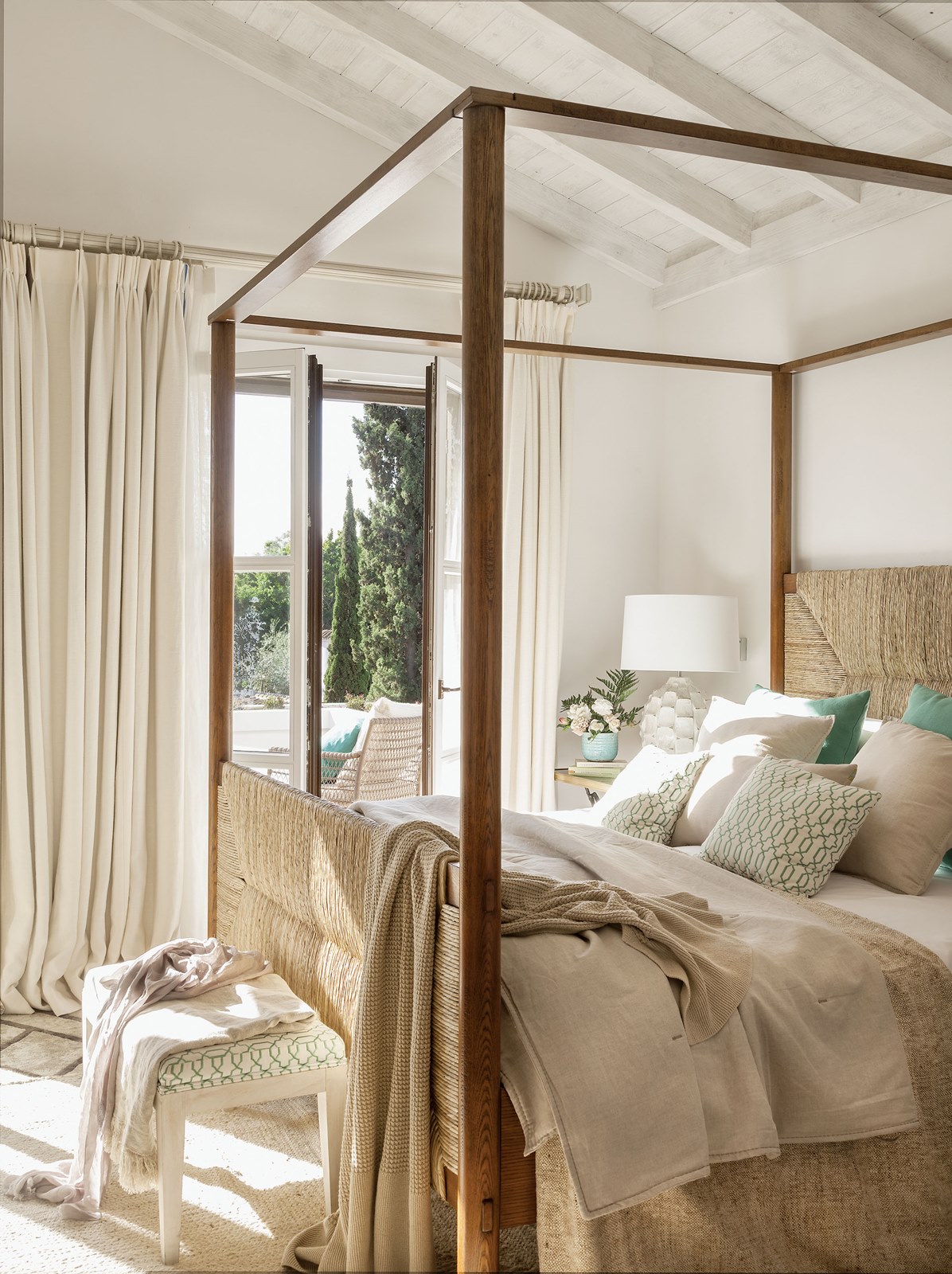Łóżko o konstrukcji baldachimowej od Ralpha Laurena. Pościel Zara Home. Wszystkie tkaniny w sypialni są z naturalnych materiałów.