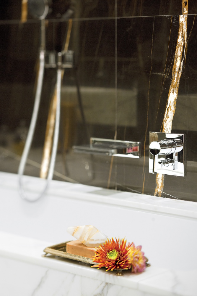 • Czarne i białe marmury są w całym domu. Chłodne ledowe podświetlenia wydobywają szlachetny rysunek kamienia.