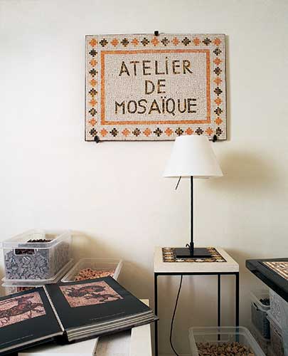 • Regał w pracowni wypełniony kolorowymi kamieniami.