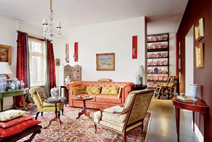 • Chińska lampa pośród waz z Delft. Do tego angielskie zasłony i tureckie dywany. Różne wzory i kolory, a wszystki