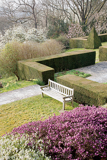 Cisowy żywopłot wyznacza granicę między dwoma poziomami ogrodu. Wokół kwitną wrzosy i żonkile.