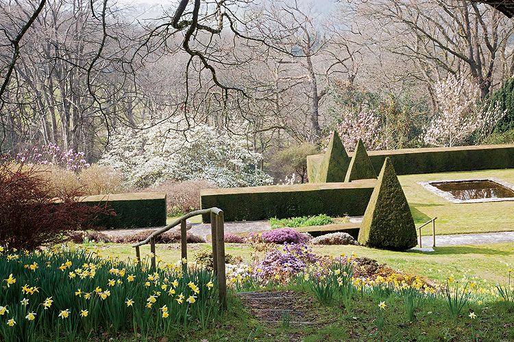 Cisowy żywopłot wyznacza granicę między dwoma poziomami ogrodu. Wokół kwitną wrzosy i żonkile.