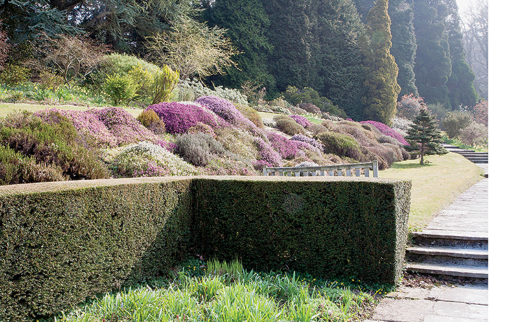 • Cisowy żywopłot wyznacza granicę między dwoma poziomami ogrodu. Wokół kwitną wrzosy i żonkile.