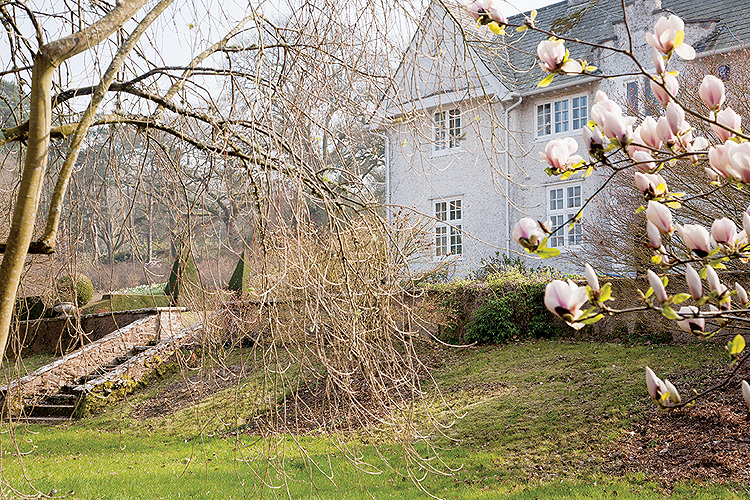 • Cisowy żywopłot wyznacza granicę między dwoma poziomami ogrodu. Wokół kwitną wrzosy i żonkile.