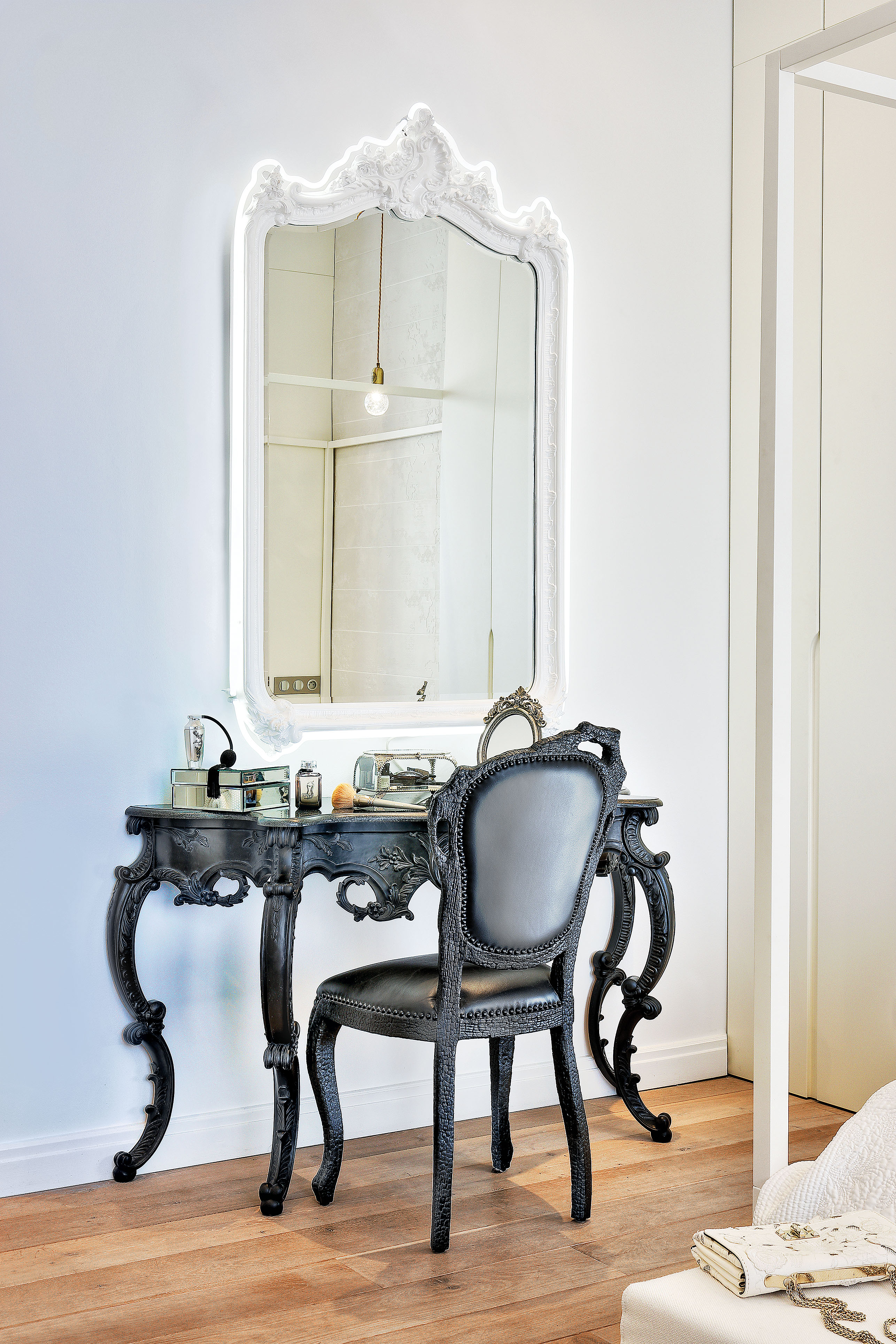 Lustro z podświetlaną ramą i kryształowe żarówki właścicielka zamówiła w firmie Lee Broom. Przy toaletce