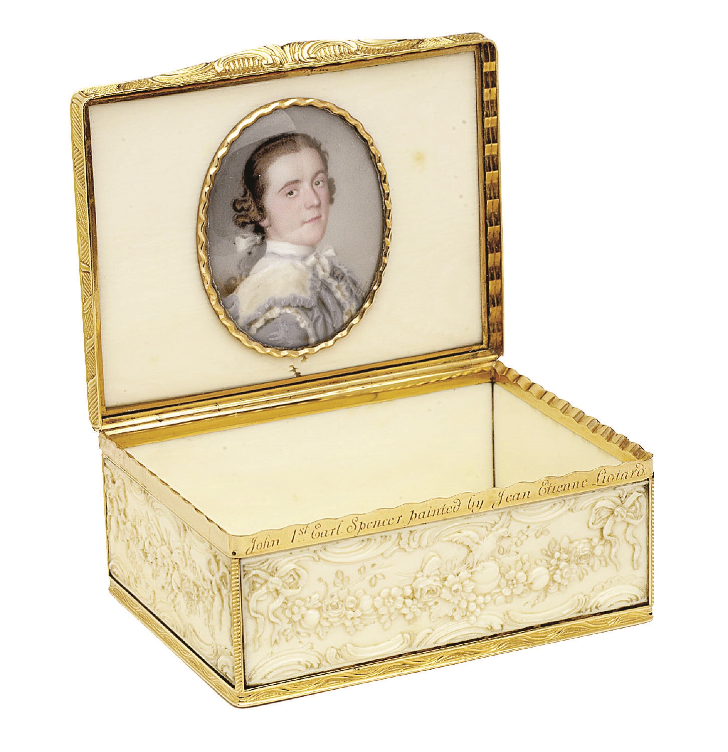 • Pudełko ze złota i kości słoniowej z miniaturą autorstwa Jeana-Étienne’a Liotarda, XVIII w.