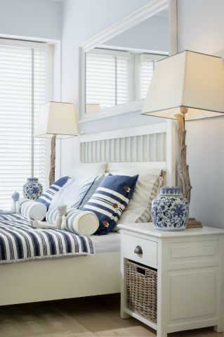 Błękit, biele i odcienie piasku, naturalne tkaniny – jedwabie i len, dużo drewna, kojarzące się z morzem i ze stylem hamptons dekoracje tworzą wakacyjny klimat tego wnętrza.