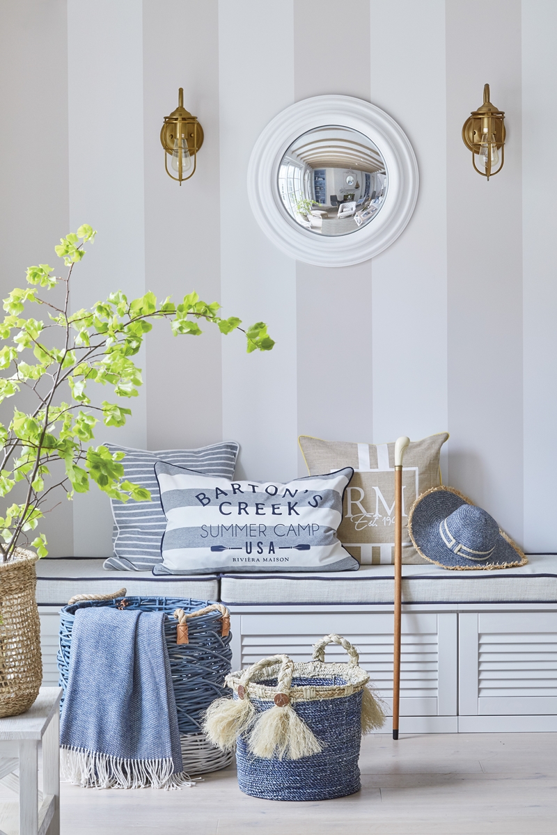 PASY NA ŚCIANIE SĄ MALOWANE, OKRĄGŁE LUSTRA — MILOO HOME, PODUSZKI I KOSZE — SWEET LIVING, PLED — NAP, ZABYTKOWA LASKA — Z KOLEKCJI WŁAŚCICIELI.
